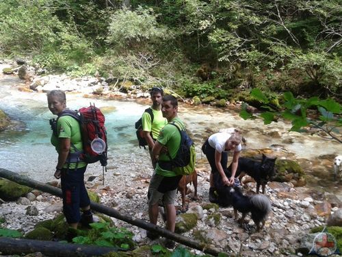 Naprej smo šli peš – po Koželjevi poti do Kamniške Bistrice. Psi so uživali v kopanju, mi pa v klepetanju 🙂 Kot bi mignil, sta minili 2 uri do cilja ”pri Jurju”. Najprej je bil na vrsti kratek počitek, za tem pa trening iskanja pogrešanih za nekdanjo Titovo vilo. Vsi psi so z veseljem poiskali skrite markerje. Privoščili smo si še malico, nato pa spet odpešačili nazaj do avtomobilov.