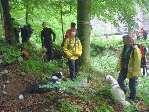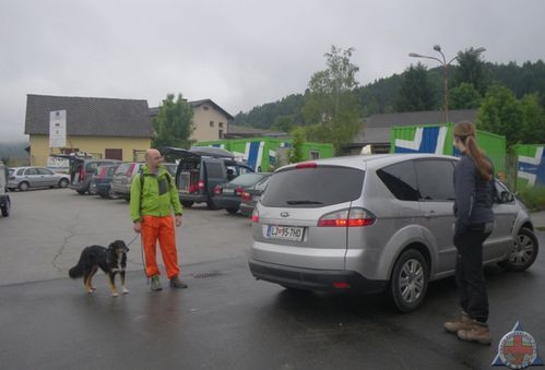 Po prijavi smo bili razvrščeni v skupine, midva sva bila v skupini 2. Ko se je skupina zbrala, smo dobili prvo nalogo – v ruševini so ostali brezdomci, ki jih je bilo treba poiskati. Koliko jih med zruški, nam ni znal nihče povedati. Razdelili smo se v dve skupini – ena je pregledala drvarnico, druga pa hišo. Midva sva začela prva preiskovati v hiši. Skway je takoj nakazal pogrešanega, ki sva ga odpeljala na dvorišče, kjer se je zgrudil in padel v nezavest. Takoj smo ga dali v položaj za nezavestnega, nato pa se je le zbudil. 🙂 Po postaji so nam sporočili, da je v drvarnici ponesrečenec, ki ga moramo na nosilih odnesti v bazo. Ko smo se vrnili na delovišče, smo ruševino še enkrat pregledali. Nato pa problem – ko sem šel po Skwaya, smo opazili, da šepa. Ugotovil sem, da ima poškodovano blazinico. Ureznina na srečo ni bila globoka, tako da sem ga odpeljal do baze in dal v avto. Tam sem mu rano razkužil in nataknil nogavico, da si šape ne bi lizal. Za Skwaya se je vaja po prvem iskanju končala, sam pa sem odšel z ekipo naprej.