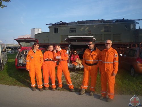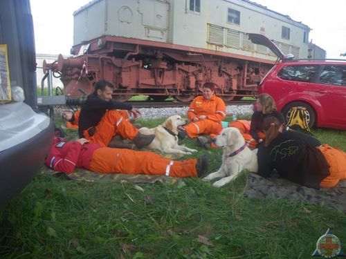V soboto, 22. 9. 2012, smo krimovci sodelovali na vaji Množična nesreča na železnici v Ljubljani, na katero nas je povabil Zavod Vizija varnosti, katerega zunanji sodelavec je tudi Dušan Veber iz DVRPS (član EHI – enote za hitre intervencije). Vaja je bila namenjena gasilcem in reševalcem, a smo v okviru regijske enote Ljubljana sodelovali tudi vodniki reševalnih psov. 12 vodnikov iz ERPS (Grega, Peter, Aleš, Anže, Lidija, Živa, Tina, Saša, Jani, Maja, Nadja, Katja ter Staša in Žana iz DVRPS) se nas je z Vero na čelu in Gregorjem kot pomočnikom razdelilo v skupine in enkrat smo odšli na iskanje v dopoldanski in enkrat v popoldanski rundi. Teren je bil ob železnici, nekaj po tirih in nekaj v okolici, markerje pa so skrili v lokomotive, vagone in zunaj po bližnji okolici. V prvi rundi je bilo nekaj težav s komunikacijo, na kar nas je Dušan opozoril, tako da je bilo to v popoldanskem delu odpravljeno. Vmes je bilo veliko čakanja, vendar smo imeli kaj videti – sodelovalo je več kot 60 gasilcev, prav toliko reševalcev, markerjev s poškodbami je bilo več kot 70 (od otrok do odraslih, ki so imeli na sebi tablice z vrstami poškodb). Res, bilo je, kot bi bila resnična nesreča – prav fascinantno, kako dvignejo lokomotivo, pa vkleščeni avtomobili pod železniškimi cisternami, polno gasilcev, ki režejo pločevino, reševalci, ki izvajajo triažo, cele kolone reševalnih vozil … Ogromno vsega, kar nekaj novega smo videli in izvedeli, vreme nam je dobro služilo, psi so dobro delali, saj smo imeli vsakič le nekaj markerjev (ni bilo vseh tistih 70 za nas 🙂 ), pasja ekipa se je super razumela. Pa kljub temu dve črni pikici; ena je bila kraja Verinega nahrbtnika, druga pa Janijevo zlomljeno zapestje. Žal se nesreče dogajajo tudi nam. Dobro, da je bilo zraven toliko reševalcev, tako da je bil Jani deležen hitre oskrbe in prevoza na urgenco.